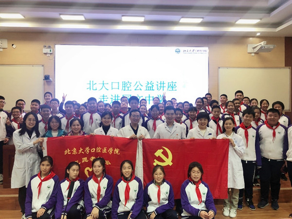 2019年11月11日,北京大学口腔医院正畸科党支部梁炜书记率领7名支部成员来到北京市石景山区鲁谷路永乐小区,在北京市同文中学,举办了一场来自北大口腔的爱牙护齿口腔公益讲座。讲座围绕儿童口腔健康知识及龋病防治展开,经过同文中学夏伟平校长和初一年级教学主任张桥老师等的精心组织,140多名学生到场参加学习讲座。