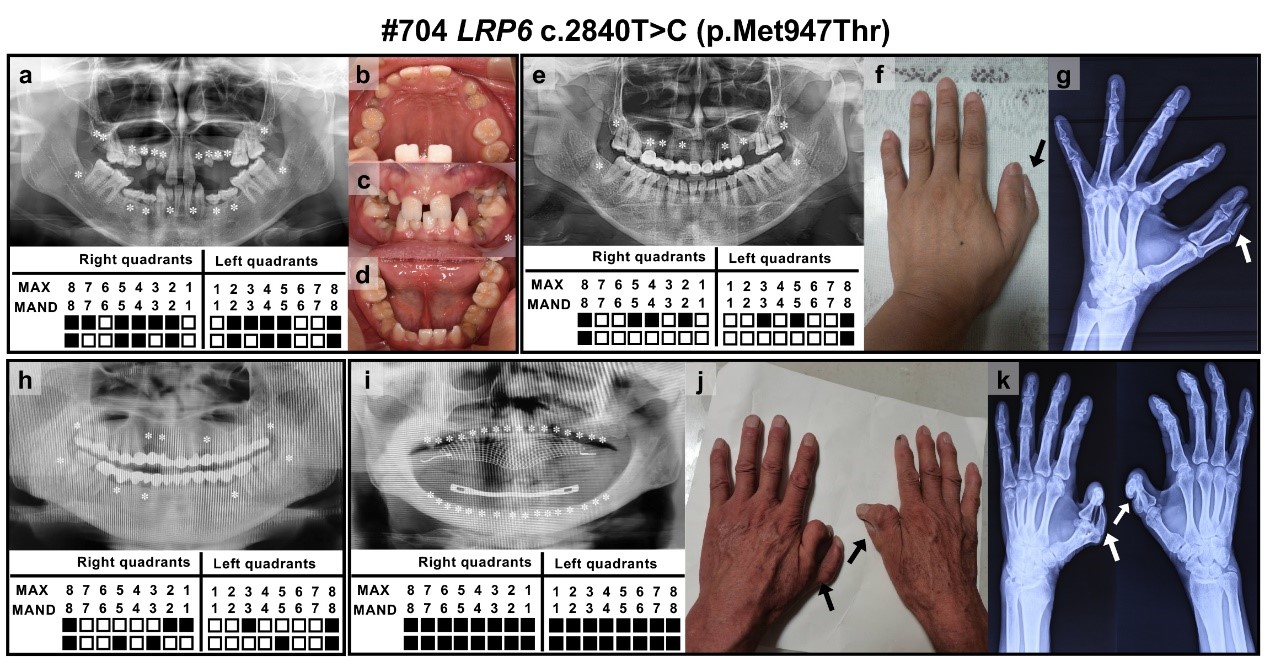 图1. LRP6新致病突变导致的先天缺牙家系成员有手指多指的新表型