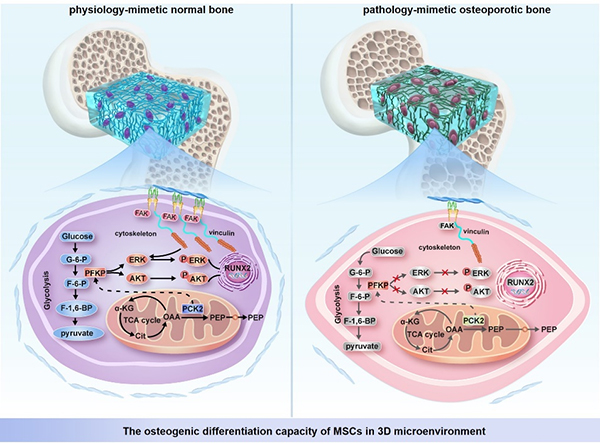 Previous work of Professor Yongsheng Zhou's team revealed that PCK2, a key enzyme of glucose metabolism, could promote bone regeneration through autophagy related pathways; PCK2 could treat age-related and estrogen-deficient osteoporosis (Stem Cells, 2019, et al.). This study further explored the role of PCK2 on regulating bone regeneration in extracellular matrix with different stiffness. The physical characteristics of 3D trabeculae network of normal and osteoporotic bone with different stiffness was experimentally mimicked, revealing a new mechanism that PCK2 promotes bone regeneration through regulating glycolysis signaling pathway in extracellular matrix with different stiffness. This study coupled the mechanical characteristics of cell metabolism with the microenvironment, providing a new perspective for promoting bone regeneration and bone defects repair under the condition of osteoporosis.